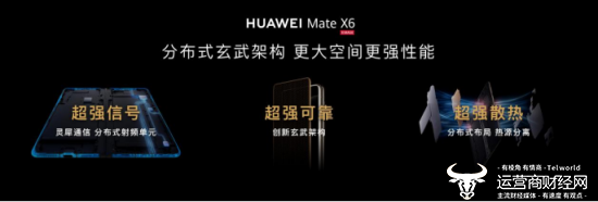 HUAWEI Mate X6首创分布式玄武架构,通过对折叠机主框和副框的零部件全新布局设计,并采用顶尖的创新材料,手机副框空间利用率提升32%[ 数据来源于华为实验室,基于HUAWEI Mate X6与未采用分布式架构机型的对比。],带来通信、散热、可靠性的全方位跃迁。