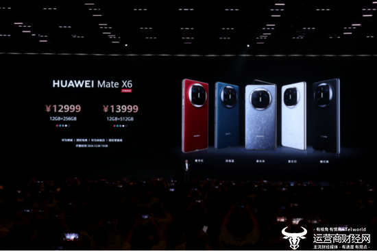 华为Mate X6于11月26日18:08开启预售,12月06日10:08正式开售,12GB+256GB售价12999元,12GB+512GB售价13999元,典藏版16GB+512GB售价14999元,典藏版16GB+1TB售价15999元,消费者可在华为商城、各大授权电商、华为体验店、授权零售商选购。