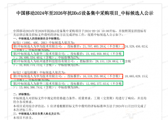 第二中标候选人新华三和第三中标候选人迪普的投标报价也远远低于最高投标限价!前者约为2344.30万元(不含税),后者约为2815.11万元(不含税)。