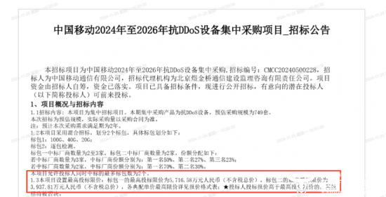 8月30日,中国移动发布“2024年至2026年抗DDoS设备集中采购项目”招标公告。该项目集中采购抗DDoS设备,预估采购规模为749套,预计采购需求满足期为2年。