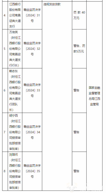 同时,江西银行南昌迎宾大道支行因违规发放贷款,被国家金融监督管理总局江西监管局罚款40万元;万俊英(时任江西银行南昌迎宾大道支行行长),被警告并罚款5万元;赖志东(时任江西银行南昌迎宾大道支行团队长)、胡宁西(时任江西银行授信审批部授信审批官)、刘琅问(时任江西银行授信审批部授信审批官)三人被监管警告。