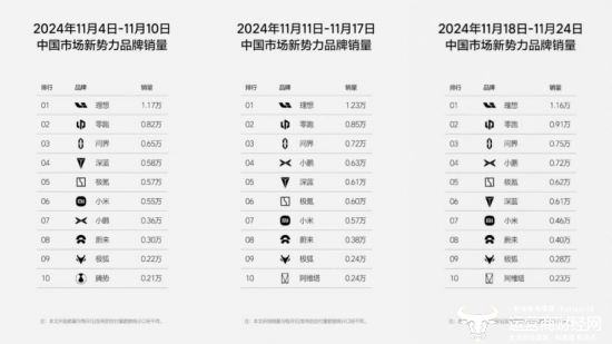 数据显示,理想汽车最新一周的销量为1.16万辆,位于榜首;零跑汽车取得了0.91万辆的周销量,居于第二位;问界则以0.75万辆的周销量排在第三名。在11月4日至11月24日这三周中,新势力品牌销量周榜的前三名一直都是这三家,且排名也没有变化。