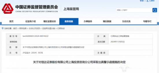 11月5日,上海证监局发布关于对信达证券上海投资咨询分公司采取出具警示函措施的决定。决定显示,该分公司在邀请外部专家参与证券投资咨询服务以外咨询服务时,存在相关管控不到位、未严格规范有关从业人员的执业行为等问题,收到了警示函。