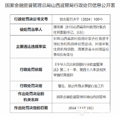 11月29日,国家金融监督管理总局山西监管局行政处罚信息公开表显示,时任山西省农村信用社联合社党委副书记、主任邢亮喜,对原山西省农村信用社联合社直接干预社员机构具体经营活动、间接审批社员机构贷款、清算资金未封闭运行事项负有责任,被监管警告,并禁止终身从事银行业工作。