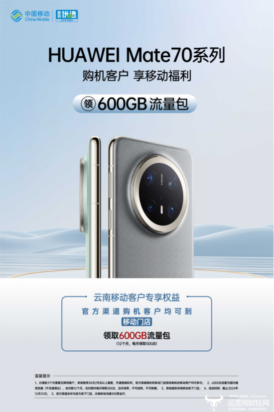 岁末换新机,就来云南移动。此次活动将截止到今年12月31日,心动不如行动,想要拥有华为Mate70系列的朋友们,赶紧到中国移动APP商城预约或云南移动线下营业厅咨询购买,双重选择,让你购机省心、放心还安心!
