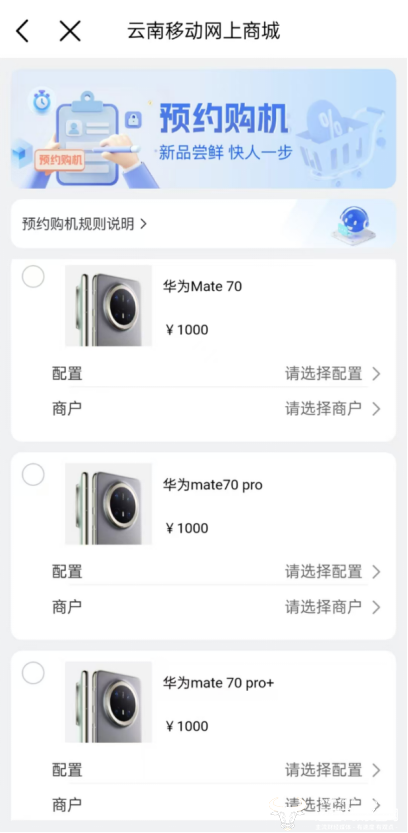 现在购买华为Mate70系列非常简单,只需登录中国移动APP线上商城,进入华为Mate70系列预约界面下单,预付1000元订金,下单成功后,就能在云南省12州市的50家店里就近的取机点提货,无需加价,也无需排队等待,就能拥有一款时尚、高性能的华为Mate70系列手机啦。