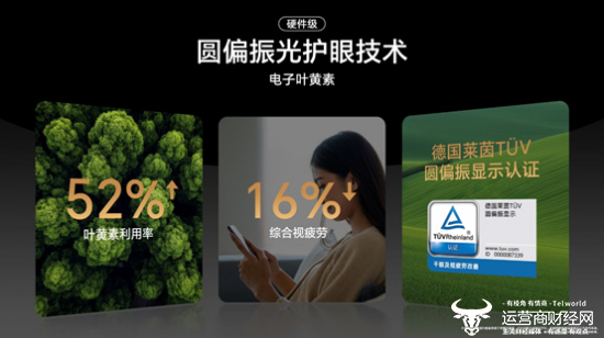 圆偏振光护眼技术有着“电子叶黄素”之称,它模仿自然光线的均匀分布,将传统屏幕的线偏振光转化为更接近自然光的圆偏振光,提高眼部叶黄素利用率,减轻视觉疲劳,给予用户如同自然光照般的舒适体验。而AI离焦护眼技术则结合了先进的离焦技术和图形算法,有效缓解视疲劳。