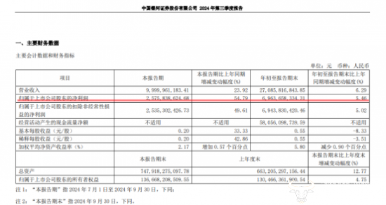 值得一提的是,据银河证券2024年第三季度报告显示,其在7月至9月期间,公司营业收入为99.99亿元,同比增长23.92%;归属于上市公司股东的净利润25.75亿元,同比增长54.79%。对此较大幅度的增长,银河证券表示主要是因为投资业务收入等营业收入增加。