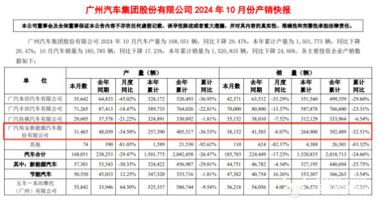但产销快报数据显示,2024年10月份广汽埃安的销量为38152辆,同比下降8.07%;前10个月累计销量为264900辆,同比下降32.51%。值得注意的是,广汽埃安今年制定了70万辆的销量目标,前10个月仅完成了目标的37.84%。
