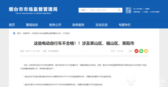 11月22日,烟台市市场监督管理局发布了一则关于烟台市市场监督管理局组织开展电动自行车及相关产品的产品质量监督抽查结果,具体情况如何呢?