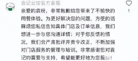 而值得一提的是,就在前不久,还有网友在社交平台晒出了袁记云饺的饺子馅上还有苍蝇在飞,官方客服在评论区回复称会严肃批评并责令改正等。