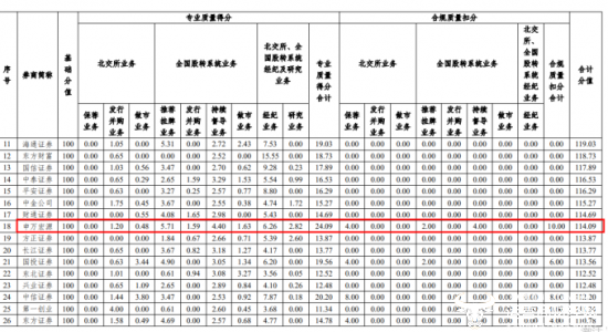 值得一提的是,在北交所发布的2024年第三季度证券公司执业质量评价结果公告中,114家证券公司中有12家证券公司子公司纳入其母公司合并评价,申万宏源承销保荐和申万宏源西部证券与母公司申万宏源证券合并评价。评价结果申万宏源在第三季度排名位于第18位,其合规质量共扣10分,是102家证券公司合规质量合计扣分最多的公司。