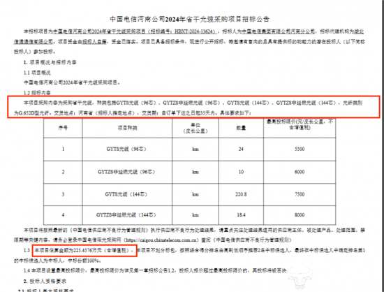 招标公告显示,本次采购内容为省干光缆,包括24kmGYTS光缆(96芯)、10kmGYTZS非延燃光缆(96芯)、220.8kmGYTS光缆(144芯)、18.4kmGYTZS非延燃光缆(144芯),最高投标限价分别为5500元/皮长公里(不含增值税)、6000元/皮长公里(不含增值税)、7500元/皮长公里(不含增值税)、8000元/皮长公里(不含增值税)。
