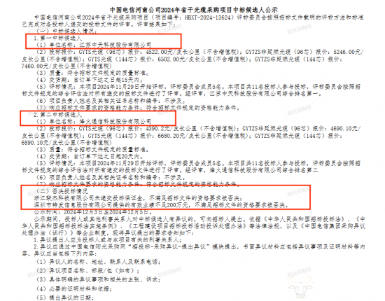 经评审,中天成为第一中标候选人,四个种类光缆的投标报价(不含增值税)分别为4522元/皮长公里;5246元/皮长公里;6502元/皮长公里;7460元/皮长公里。