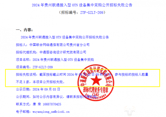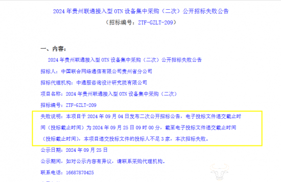 9月3日,贵州联通第一次公示招标失败,原因是截至投标截止时间,参与投标的投标人数量不足3家;次日,贵州联通第二次发标,结果还是因为递交投标文件的投标人不足3家而招标失败。
