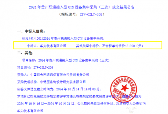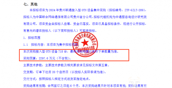7月26日,贵州联通首次发布“2024年接入型OTN设备集中采购”招标公告。采购内容是接入型OTN设备718台,采购预算达2297.6万元(不含税),不接受代理商投标,不允许联合体投标,中标人数量为1个,中标份额100%。