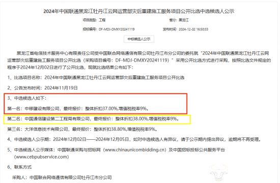 经比选,中移建设有限公司以整体折扣37%;增值税税率9%的最终报价,成为第一中标候选人。