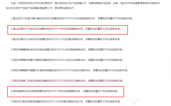 从通告上可以看到,这两款不合格电动车分别是由福山区清洋大杰电动车店销售的型号为TDT7404Z的绿源牌电动车和莱阳晓娜电动车经营部销售的型号为TDT7408Z的绿源牌电动车,不合格项目都是蓄电池防篡改不符合国家标准。