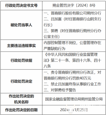 12月3日,国家金融监督管理总局朔州监管分局行政处罚信息公开表显示,晋商银行朔州分行因内部控制管理不到位,公章管理存在严重缺陷行为,被责令改正并罚款40万元。
