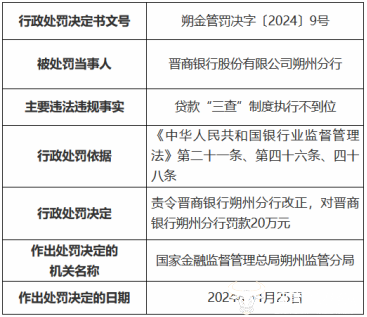 同日,晋商银行朔州分行还因贷款“三查”制度执行不到位,被责令改正并罚款20万元。