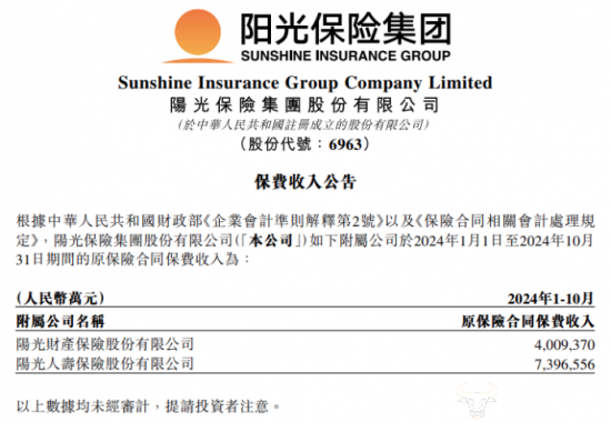 值得一提的是,据阳光保险11月中旬发布的保费收入公告显示,在前十个月,阳光产险及阳光人寿的原保险合同保费收入分别为400.93亿元、739.65亿元。