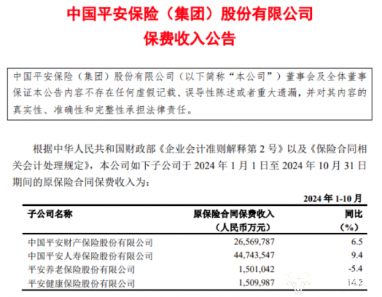 值得一提的是,据平安保险公布的前十个月的保费收入公告显示,截止10月31日,平安财险、平安人寿、平安健康险的原保险合同保费收入都有所增长,增长幅度为6.5%、9.4%、14.2%,而平安养老的原保险合同保费收入出现了下降,降幅为5.4%。