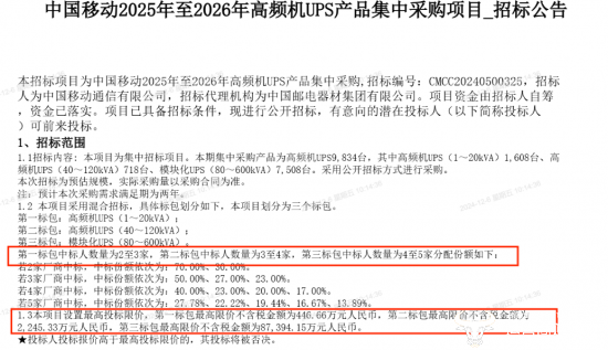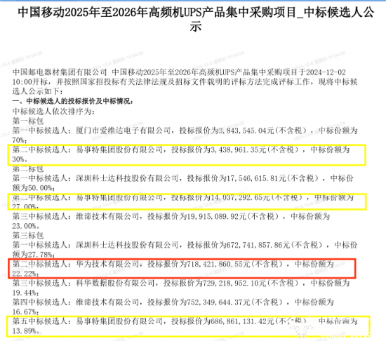 近日,中国移动公布“2025年至2026年高频机UPS产品集中采购项目”中标候选人名单。该项目规模很大,然而华为作为中国移动优秀供应商竟然只中标了1个标包,份额也不高,具体是什么情况?