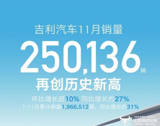 数据显示,今年1-11月吉利汽车累计销量已达1966512辆,同比增长约31%,已经超过原目标,实现200万销量指日可待。