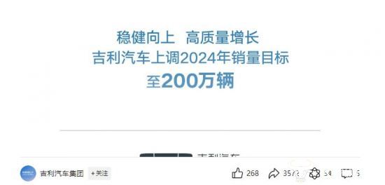 基于对自身发展信心,在吉利汽车2024年一季度业绩交流会上,吉利汽车集团CEO淦家阅透露“集团管理层一致决定把2024年的全年目标调整到200万辆”。据悉,原目标销量为190万辆。