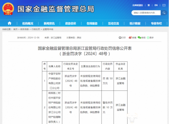12月6日,浙江监管局发布的行政处罚信息公开表显示,平安财险浙江分公司存在“未按照规定使用经批准或者备案的保险条款、保险费率”的违法违规事实,被罚款50万元。