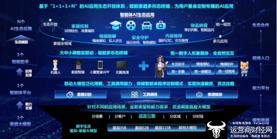 通过融合智能体、数字人等前沿技术,“星辰•家庭大模型”支撑构建“1+1+1+N”的AI应用生态开放体系,赋能多形态终端,为用户量身定制专属的AI智能助手,实现设备联动控制、内容交互推荐、情感陪伴对话、物品智能收纳、家庭安全守护等功能。