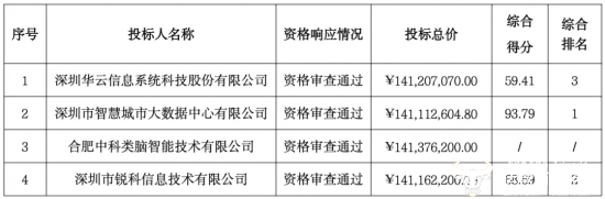 12月6日,该项目发布了中标结果,深圳市智慧城市大数据中心以141,112,604.80 元的投标报价中标。