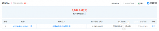 天眼查APP显示,12月5日,中通客车新增一条被强制执行信息,执行法院是深圳市坪山区人民法院,执行标的达1004.65万元,案号为(2024)粤0310执4911号