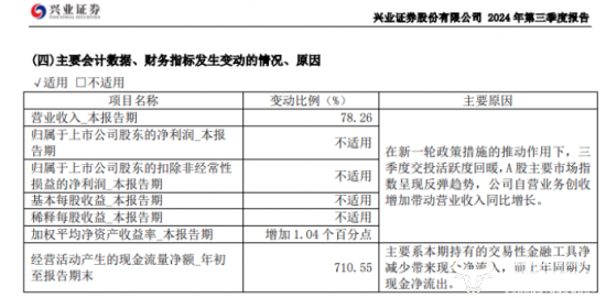 值得一提的是,据兴业证券2024年第三季度报告显示,在7月至9月期间,公司营业收入同比增长78.26%。第三季度营业收入的增长主要是因为:在新一轮政策措施推动下交投活跃度回暖,A股主要市场指数呈现反弹趋势,自营业务创收的增加带动了营收的增长。