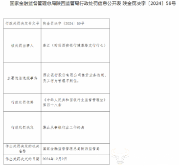 12月10日,据国家金融监督管理总局陕西监管局行政处罚信息公开表显示,西安银行存在信贷业务违规、员工行为管理不到位的违法违规事实;时任西安银行健康路支行行长秦江被禁止从事银行业工作终身。