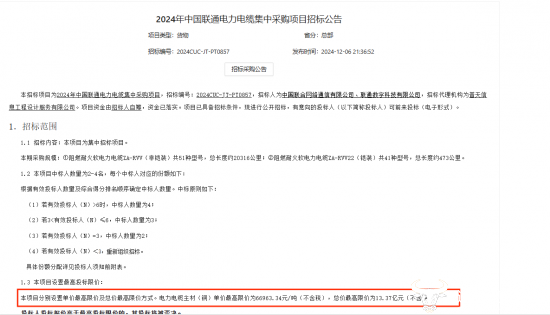 12月6日,中国联通发布“2024年电力电缆集中采购项目招标公告”。项目为集中招标,采购内容是两类产品,一是51种型号的阻燃耐火软电力电缆ZA-RVV(非铠装),总长度约20316公里;二是41种型号的阻燃耐火软电力电缆ZA-RVV22(铠装),总长度约473公里。