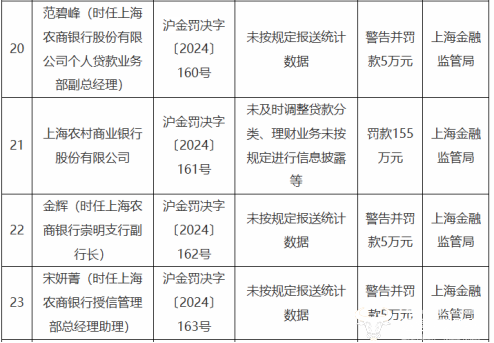 12月11日,上海金融监管局披露的行政处罚信息显示,沪农商行因未及时调整贷款分类、理财业务未按规定进行信息披露等,被罚155万元。时任沪农商行个人贷款业务部副总经理范碧峰、时任沪农商行崇明支行副行长金辉、时任沪农商行授信管理部总经理助理宋妍菁分别受到警告,并处罚款5万元。