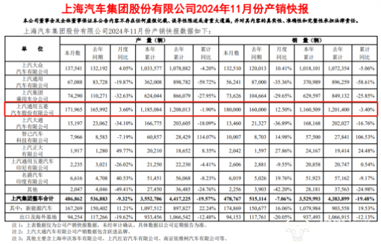 据上汽集团2024年11月份产销快报显示,该月上汽通用五菱的销量为18万辆,同比增长12.5%;前11个月,上汽通用五菱累计销售汽车116.05万辆,同比下降3.4%。