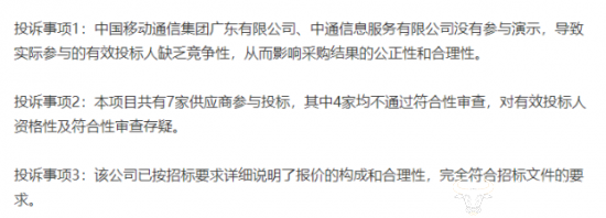 公告显示,投诉广东联通的不是广东移动或者广东电信,而是广州华工信元通信技术有限公司。该公司在本次投标过程中因未通过报价合理性评审,没有通过符合性审查。它从三个方面发起投诉: