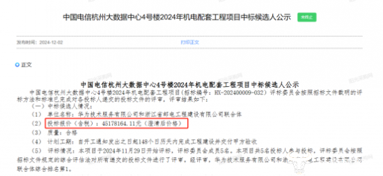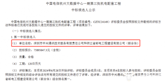 近日,中国电信杭州大数据中心4号楼2024年机电配套工程项目中标候选人公布,最终谁中标?