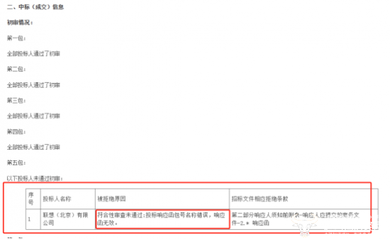 值得注意的是,第一包至第四包的全部投标人均通过了初审,而在第五包中,联想(北京)有限公司未通过初审,其被拒绝的原因是,“符合性审查未通过:投标响应函包号名称错误,响应函无效。”
