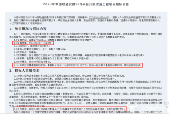 从招标公告来看,该项目是SEQ平台补充5G用户面数据工程的建设,要求新增至少600Gbps 5G数据采集解析能力和5G数据业务管理能力。规模确实不大,采购预算仅为330.06万元(不含税),交付期限为自合同签订之日起90个自然日内完成软件上线的部署、具备相应5G数据采集和管理能力,并要求有1年的保修期。