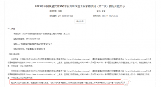 近日,联通某省公司SEQ平台升级改造工程采购项目(第二次)招标宣布失败,最后决定与唯一潜在投标人进行单一来源谈判采购。