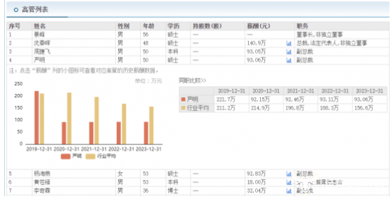 此外,据东方财富网显示,严明在2023年的薪酬为93.06万元,虽然与同级别的其他四位副总裁相比相差金额不大,但与总裁沈春晖的薪酬140.9万元相比,相差较大。
