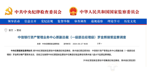 9月27日,中央纪委国家监委网站显示,中信银行资产管理业务中心原副总裁(一级部总经理级)罗金辉涉嫌严重职务违法,目前正在接受调查。