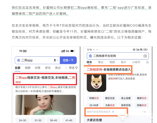 12月16 日晚,李二狗通过官网微信公众号“二狗APP单身青年自救平台”发长文,称在此实名举报,珍爱网公司长期侵犯二狗APP商标权,冒充“二狗”APP进行广告投放,诱骗想使用二狗产品的用户进入珍爱网。