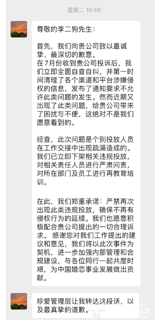此外,根据发布的内容,李二狗此前已与褚涛就上述问题进行沟通,相关聊天截图显示,褚涛曾向李二狗转达珍爱网管理层的回复,文字显示其第一时间清理了各个渠道和平台涉嫌侵权的信息,并解释称此次问题是个别投放人员在工作交接中出现疏漏造成的,“我们已立即下架相关违规投放对相关责任人员进行严肃问责对所在部门及员工进行再教育培训。珍爱网同时承诺严禁再次出现此类违规投放。”