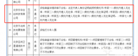 值得一提的是,该标段中,有多达24家企业未通过资格审查,原因也是各式各样。其中,东华软件子公司东华合创因为委托代理人无社保(证明),资格审查详细评审不合格;太极计算机因为资格打分未入围,所以没有通过资格审查。
