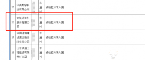 相比东华合创,太极计算机遇到的情况并不算稀奇,在24家未通过资格审查的企业中,15家均因为“资格打分未入围”被刷。
