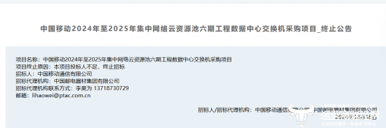 而原本以为项目就这样被华为和中兴拿下,但没想到却出现了意外。12月18日,据通信工程建设项目招标投标管理信息平台发布的公告显示,该项目因投标人不足,终止招标。